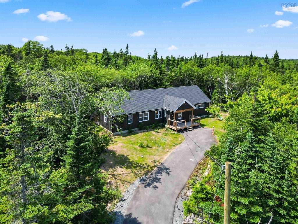 Welcome to 99 Wilderness Drive, your perfect balance of one level living new construction that’s all about luxury and ultimate privacy in a woodland setting. This 2 bed 2 bath one story slab on grade home is located on 5 acres of land in Avalon Park, a gated community in beautiful Portuguese Cove. Enter the spacious foyer for a view into the gorgeous great room, with soaring ceilings and wood beams it’s such an open and inviting space. A modern white kitchen with quartz counters, glass backsplash, and all brand-new stainless-steel appliances will be great for the chef of the family who will enjoy the green view from the huge windows and oversized patio doors. The back deck runs the length of the house and is an easy step into the backyard. On one side of the home is the primary bedroom, also featuring patio doors to the deck, a massive walk-in closet, and a dreamy ensuite with custom tile walk in shower. The other side offers a second bedroom, and the main bath with tiled shower/tub and laundry. There are some very “smart” upgrades in this home too! Starlink is included, along with a full camera system and motion detectors around the perimeter, as well as a full Alexa system to control lights and cameras. A large shed is perfect for storage, and the paved driveway offers ample parking. Avalon offers community exclusive access to five lakes, lots of hiking trails and nearby ocean views. Be in downtown Halifax in 30 minutes or be at Crystal Crescent beach in under 20! It’s a lifestyle and such a unique property it’s the one you’ve been waiting for!